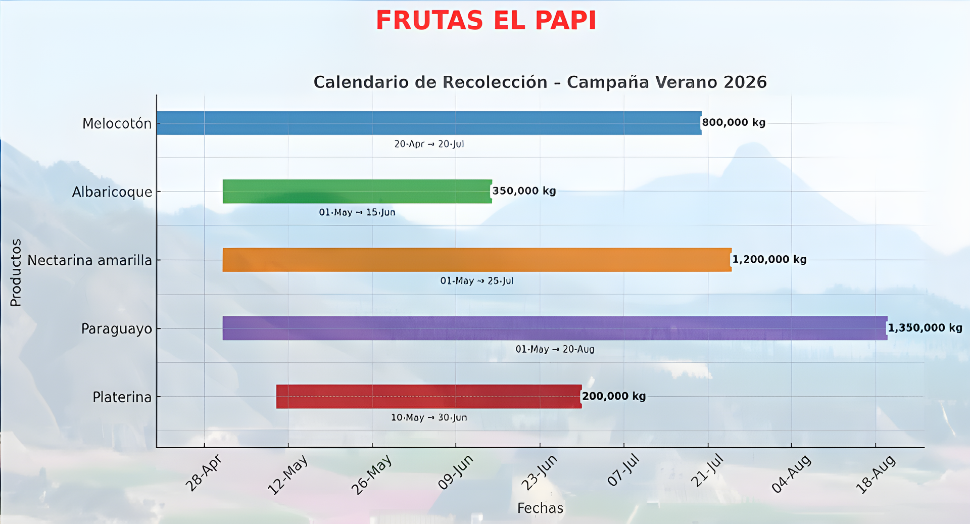 Les produits sont tous de notre propre production, récoltés directement dans nos champs, notamment les abricots, les nectarines, les pêches rouges, les pêches du Paraguay et les pêches plantain :